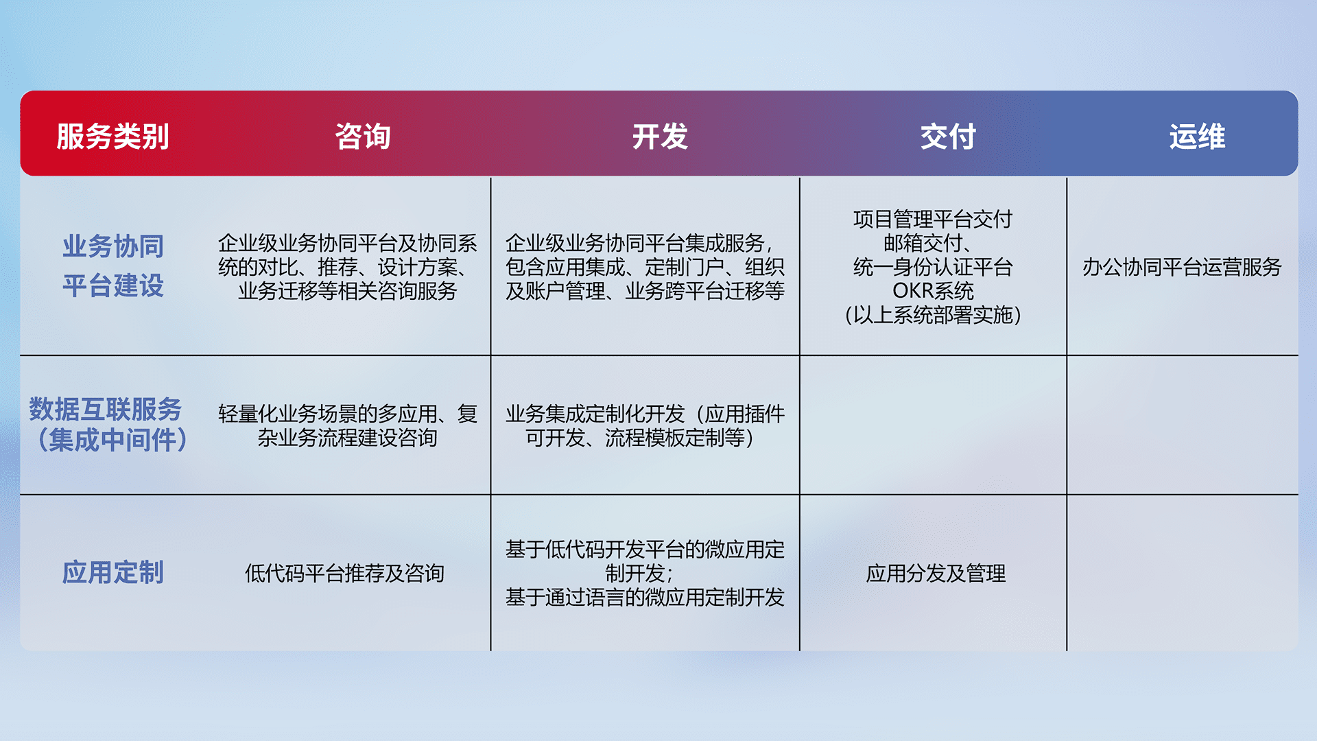 针对钉钉、、企微、、、、IDaas等平台级产品提供产品的规划、、、方案、、交付、、定制化开发等服务,,,实现如统一协同办公、、智能客户服务、、混合会议管理、、、、智能数据查询、、、、等业务场景,,实现数字化转型。。。