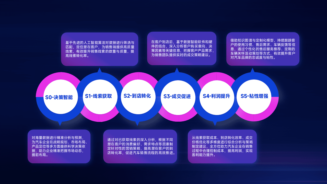 基于销售转化漏斗的薄弱环节,,为客户提供数据+模型+运营的智能应用,,,实现销售业绩的提升;推动线索管理全链路的精细化管理和运营。。。